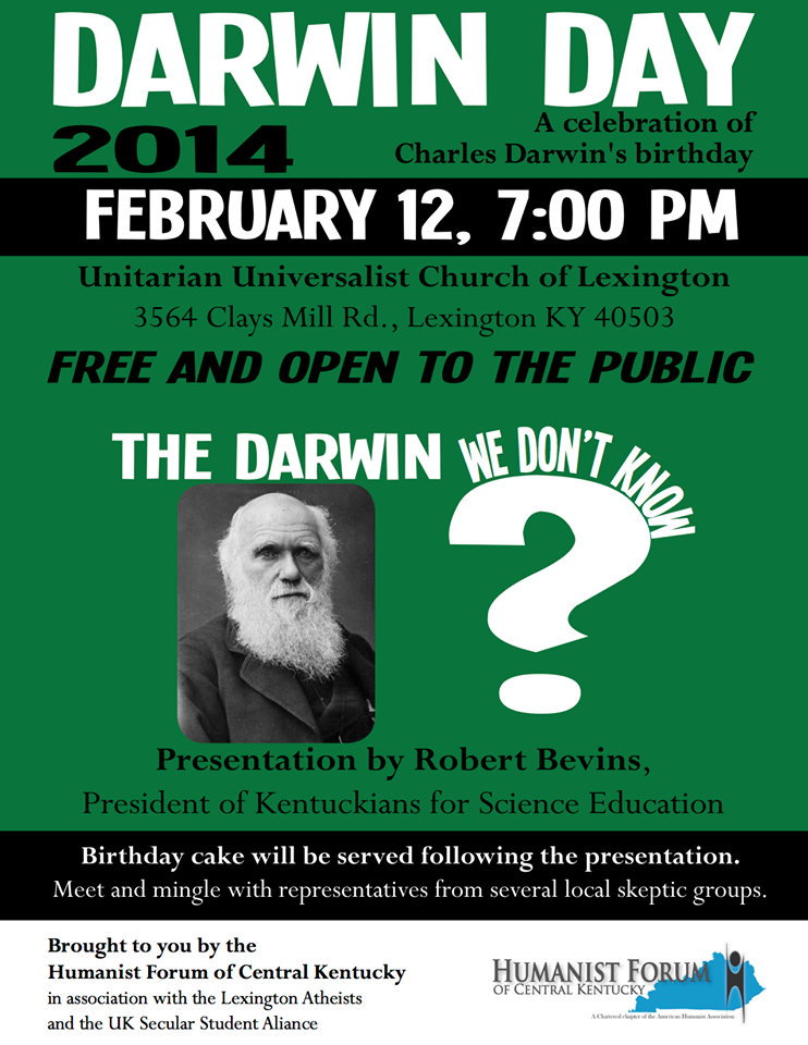 Wednesday, 12 February, in the Great Hall of the Unitarian Universalist Church of Lexington Dr. Robert Bevins, President of Kentuckians for Science Education (KSE), will present "The Darwin We Don't Know." Robert received his BS in Biology from Georgetown College and PhD in Toxiclogy from the University of Kentucky. He has taught biology at Georgetown as an adjunct and visiting assistant professor. He was "inducted into skepticism at birth having been born on a Friday the 13th." KSE advocates for the improvement of science standards of education and teaching science in accordance with the best scientific evidence available.